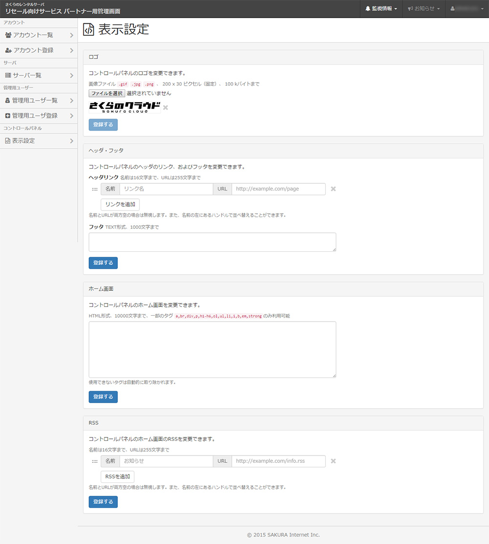 表示設定 エンドユーザコントロールパネルのカスタマイズができます。