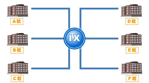 多数のISPが相互に接続するとき、それぞれが1回線ずつ持ち寄ってIXに接続しポイントを共有することにより、リソースを有効に使うことが出来ます。