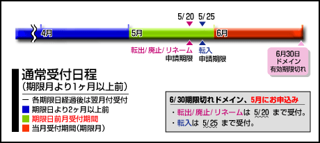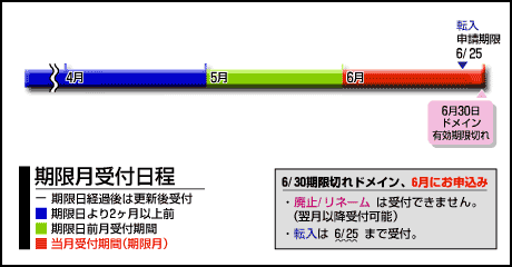 期限月前月26日(転入)または21日(転出、廃止)以降から期限月当月にお申込み頂いた場合、全ての作業はドメイン期限日迄に完了させることはできません。