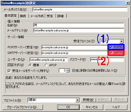「ツール」「メールボックスの設定」「基本設定」タブにおいて、"POP3サーバ(受信)"の右側のPOP3Sを選択します(下図1)。その際「ポート番号をSSL標準の995に選択しますか?」と聞かれるので「いいえ」を選択します。