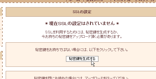 初めて作成する場合、SSL設定がされていない旨表示されます。「秘密鍵を生成する」を選択します。