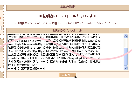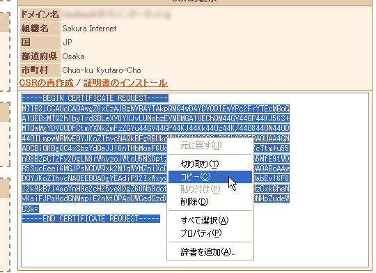 作成したCSRを認証局へ申請します。尚、さくらインターネットでは代行申請を承っておりません。申請に関する詳細については各認証局を運営する事業者のホームページをご参照ください。