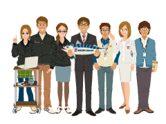 - A. 当社ウェブサイトなどに登場するイラストキャクターたちは、さくらインターネットのサービスをご利用になるお客様や、当社スタッフがモデルになっています。現在のところ、公式な名前のついたキャラクターはいませんが、大阪本社・東京支社の受付に設置されている等身大パネルの女性キャラには、社員証がかけられていますので、ご興味のある方はご覧ください。