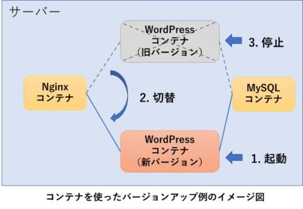 また、上記はデータベースとしてのMySQLコンテナとWordPressコンテナが分かれています。そのため、「WordPressのバージョンを上げたい」といった場合には、WordPressの新しいバージョンのコンテナをもう一つ起動し、問題なければ、古いWordPressコンテナを削除する、という段取りを踏めば、切り戻しなどもしやすいため、バージョンアップなどの対応も敷居が下がるのもよいと思ってます。