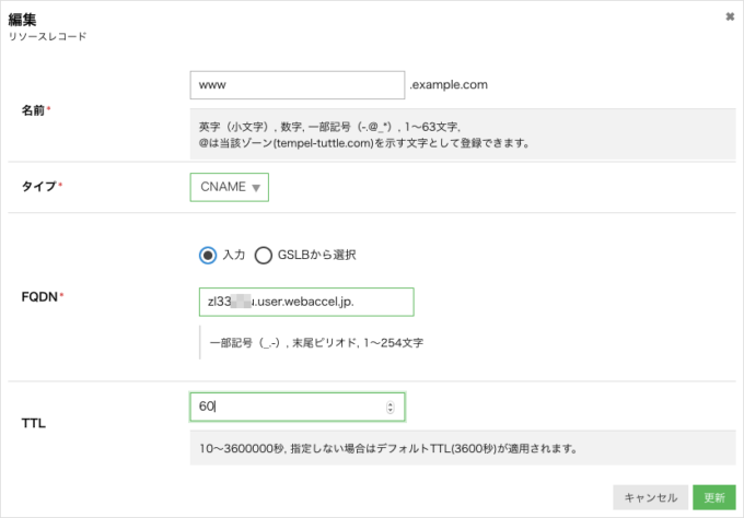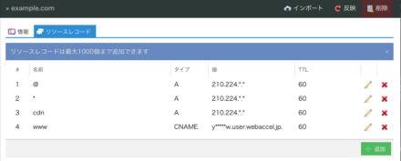 事前作業でTTLは60秒になっていると思います。ここで一つ大事なことを書いておきますが、CNAMEを設定しようとすると、同じサブドメイン(今回の例では www.example.com )にAレコードやTXTレコードは設定できません。つまり、Aレコードがある状態でCNAMEレコードを追加することはできないので、Aレコードを削除してからCNAMEレコードを設定することになります。ウェブアクセラレータの場合はドメイン所有確認のためTXTレコードを設定していると思いますので、これをまず削除します(動作には影響ありません)。