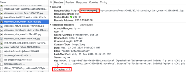 連載第3回でも触れておりますが、WordPressの管理画面(/wp-admin/配下)などはキャッシュをオフにした方がオペレーション上都合が良いので、そのあたりも設定していれば動作確認した方が良いでしょう。特に、Amazon CloudFrontを利用する場合、WordPressサイトはキャッシュ除外設定、Cookie転送設定などを入れないと管理画面が正常に動きません。さくらのCDNウェブアクセラレータでは設定内容がシンプルな代わりにこのあたりの煩雑な設定が必要ありません。一通り確認を終えたらTTLを元の長いものに戻しておきましょう。キャッシュされているかいないかの確認方法も、マニュアルサイトに記載されています。Chromeデベロッパーツールで、下の画像のように期待したファイルのX-Cache: HITになっていることを確認できたらOKです。