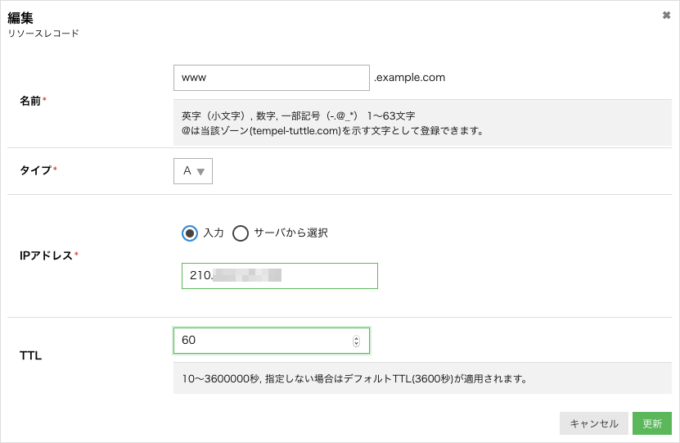 というわけで設定値を変更しましょう。DNSサーバの管理画面などでTTLを60にします。