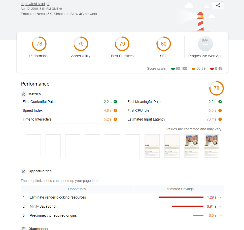 $ ./node_modules/.bin/lighthouse https://test.srad.jp/ --chrome-flags="--headless" ChromeLauncher Waiting for browser. +0ms ChromeLauncher Waiting for browser... +1ms ChromeLauncher Waiting for browser..... +520ms ChromeLauncher Waiting for browser....... +501ms ChromeLauncher Waiting for browser......... +501ms ChromeLauncher Waiting for browser.........? +2ms status Connecting to browser +192ms status Resetting state with about:blank +25ms status Benchmarking machine +18ms status Initializing… +506ms : : status Generating results... +0ms Printer html output written to /home/hylom/test/test.srad.jp_2019-04-12_18-51-54.report.html +86ms CLI Protip: Run lighthouse with `--view` to immediately open the HTML report in your browser +0ms ChromeLauncher Killing Chrome instance 2425 +1ms
