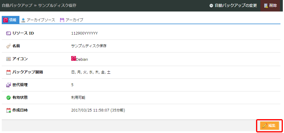 - 自動バックアップで作成されたアーカイブは、作成完了~削除完了まで課金対象となります(ステータスが[失敗]となったものについては請求は発生しません)。