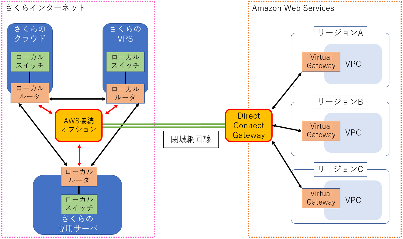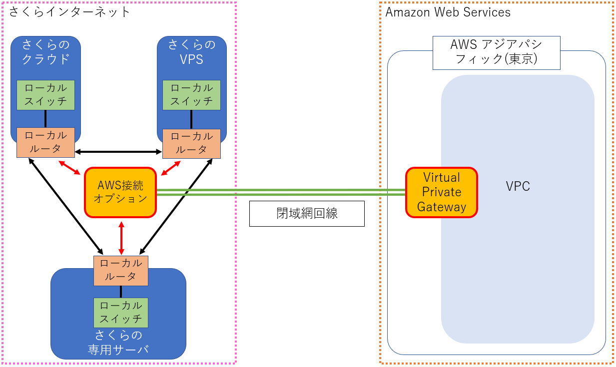 さくらインターネットが提供する さくらのクラウド 、 さくらのVPS 、 さくらの専用サーバ の各サービス内に接続された ローカルルータ と、お客様が Amazon Web Services (以下AWSと省略します)環境内に作成したVPCを、インターネットから隔離された閉域網で相互接続するサービスです。