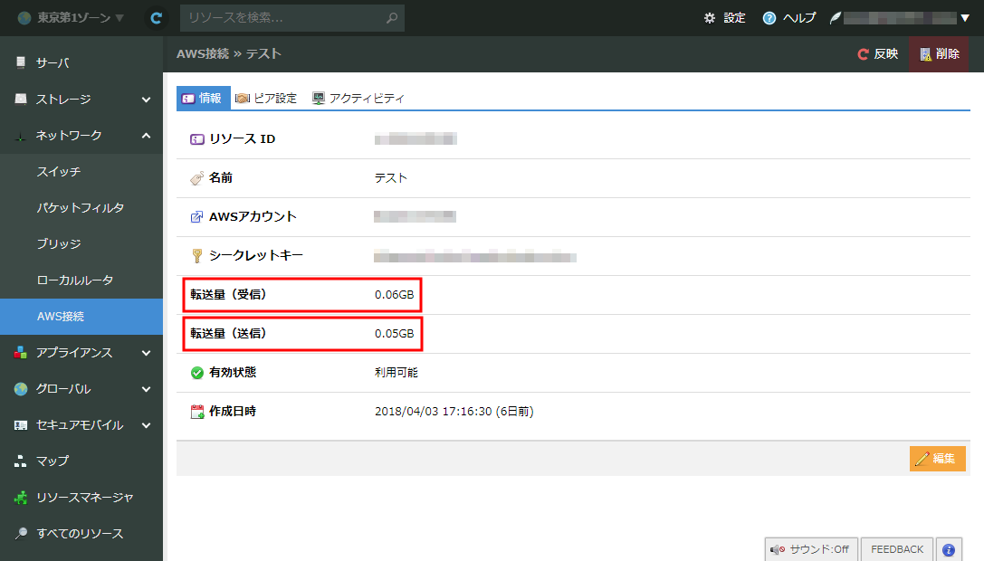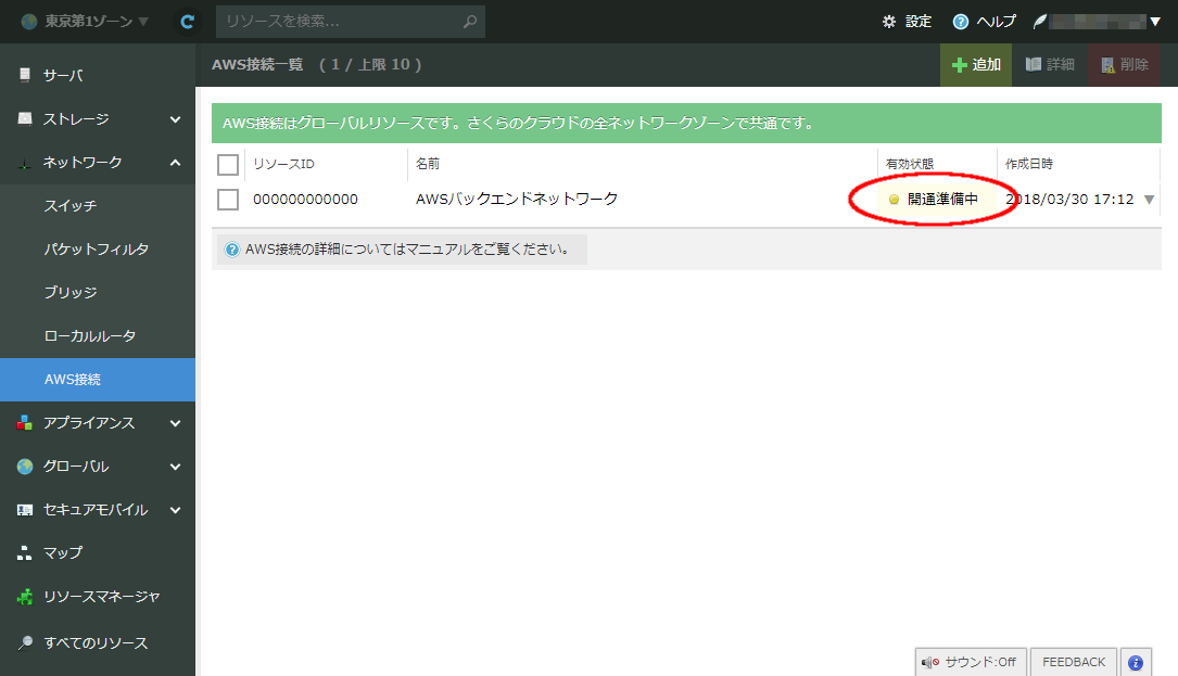 AWS接続も各サービスのローカルルータと同様に振る舞うため、ピア設定手順についても他のローカルルータと同様です。詳しくは ローカルルータ ページ内のピア設定手順を参照ください。