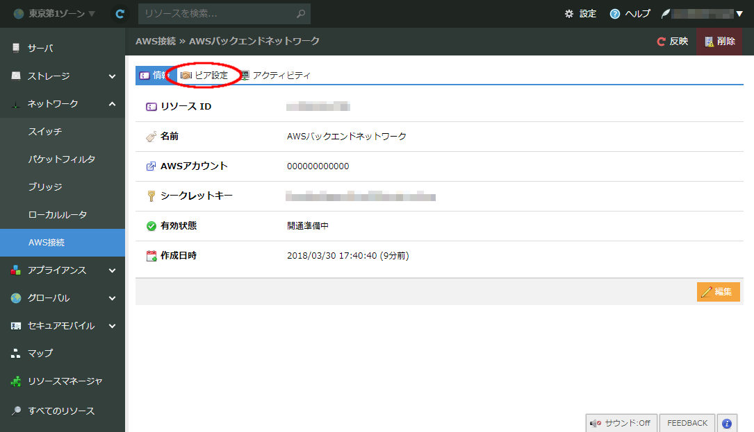 新たなAWS接続の作成後、弊社により前段の開通作業が開始されます。また、お客様側にて弊社各サービス内に設置されたローカルルータと作成したAWS接続のピア設定が行える状態となります。一覧画面でお申し込み時に作成した接続をダブルクリックし、上の「ピア設定」タブをクリックします。