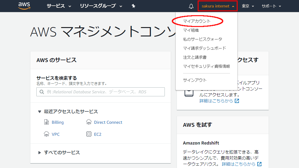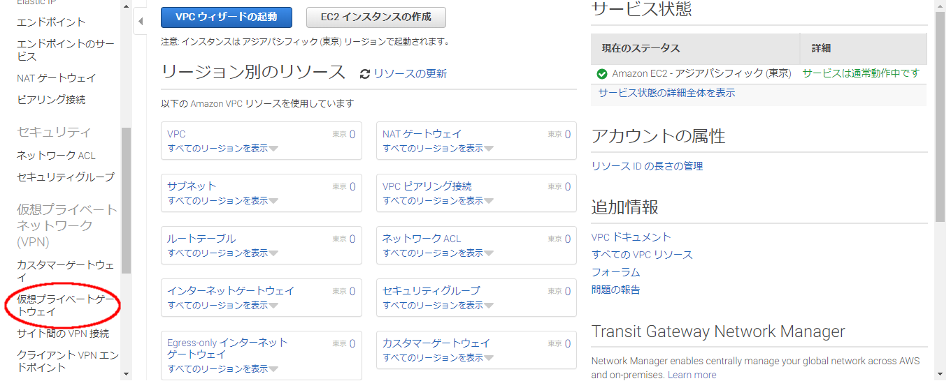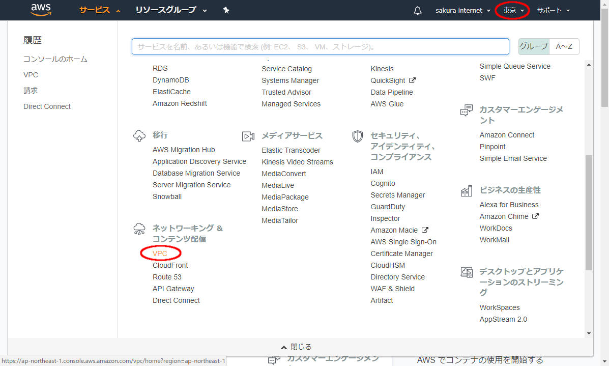 AWSマネジメントコンソールからVPCの管理画面を表示します。また、右上のリージョン選択メニューより、接続先となるリージョンが選択されていること(アジアパシフィック(東京)であれば「東京」の表示)も合わせて確認します。