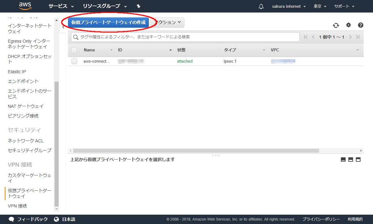 さくらのクラウドとAWSを接続する閉域網はEquinix TY2 Direct Connectロケーションに接続しており、「アジアパシフィック(東京)」リージョン(リージョンコード: ap-northeast-1)内の単一のVPCに接続する場合はVirtual Private Gatewayを作成することで接続する事が可能です。