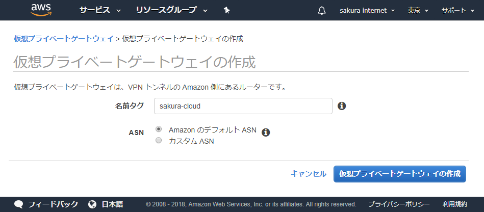 作成画面では、「名前タグ」欄に分かりやすい名前を入力し「仮想プライベートゲートウェイの作成」ボタンをクリックします(ASNの選択ラジオボタンはデフォルトの「AmazonのデフォルトASN」が選択されていることを確認してください)。