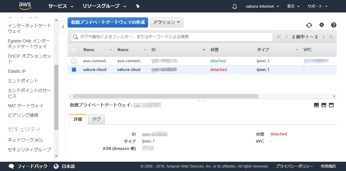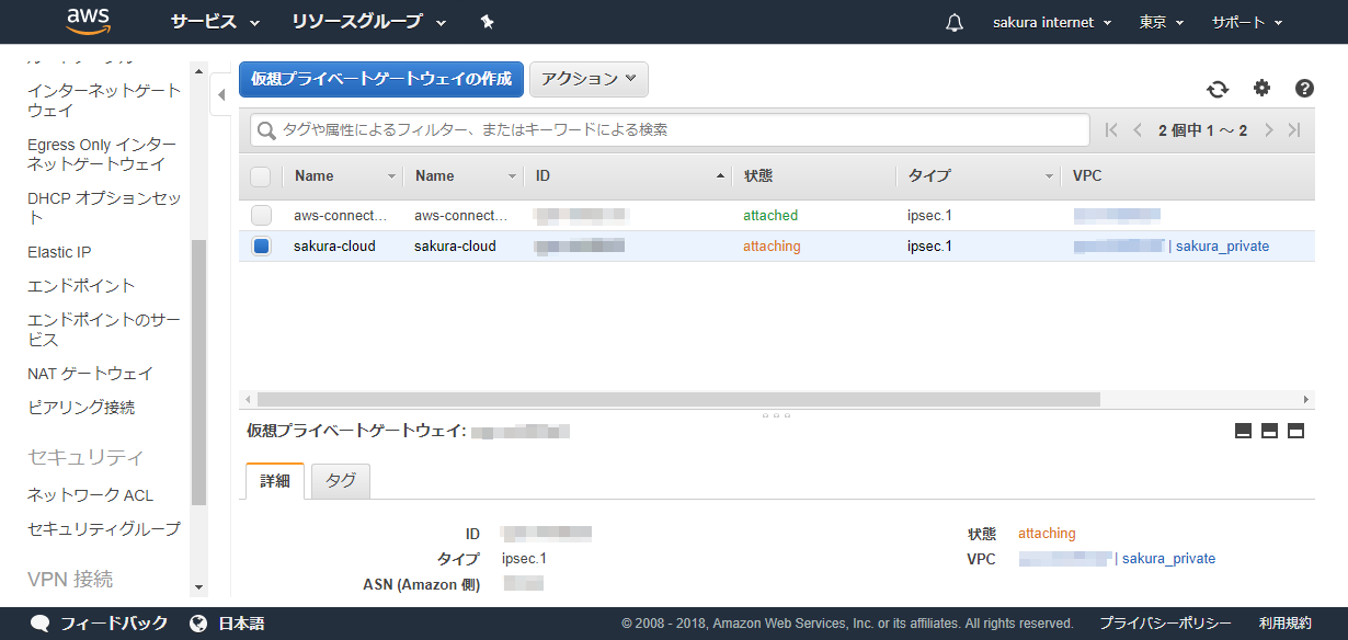 ・仮想プライベートゲートウェイの作成とVPCへのアタッチ¶