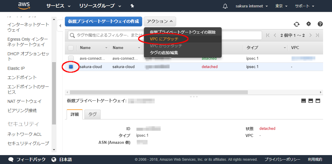 このプライベートゲートウェイを選択し「アクション」メニューから「VPCにアタッチ」を選択します。