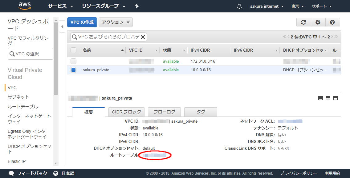 AWS側にあるVPCネットワークも、さくらインターネット内でローカルルータに接続されたサービスのひとつと同様に振る舞うため、ルーティング設定手順についても ローカルルータ ページ内のルーティング設定手順を参照ください。