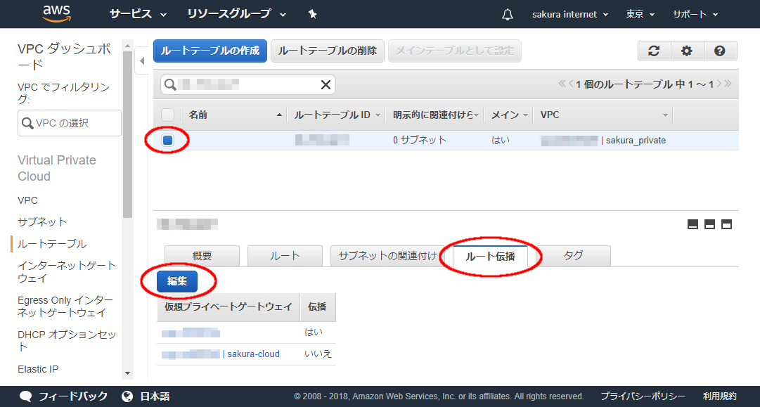 リストから該当のリンクテーブルを選択し、下部に表示される画面から「ルート伝搬」タブを選択します。仮想プライベートゲートウェイのルート伝搬設定状況が表示されますが、アタッチしたVPCのルート伝搬はデフォルトでは「いいえ」状態のため、これを変更するため「編集」ボタンをクリックします。