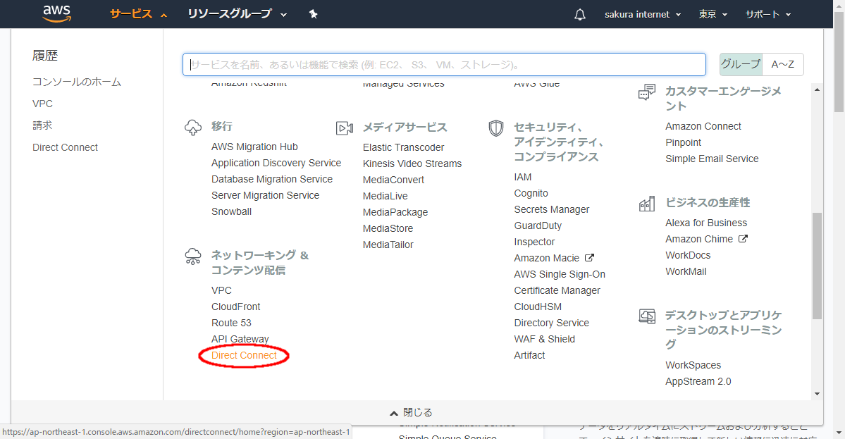 AWSマネジメントコンソールからDirect Connectの管理画面を表示します。Direct Connect Gatewayはリージョンに依存しない設備のため選択中のリージョンはどの場所でも構いません。