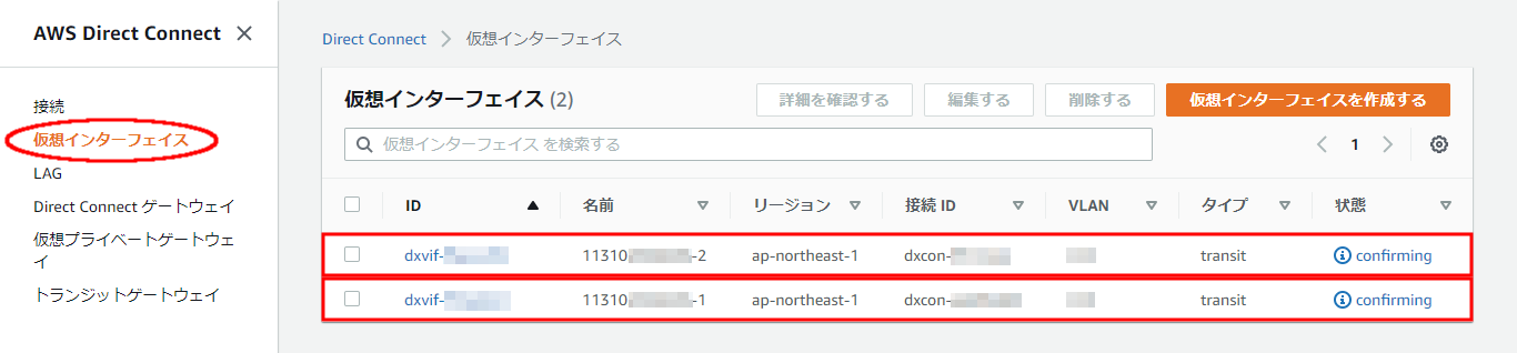 左側のメニューより「仮想インターフェイス」を選択すると、承諾待ち(状態が「confirming」)の仮想インターフェイスが表示されます。表示名がさくらのクラウド側で作成したAWS接続のリソースIDに、冗長構成のため末尾に「-1」と「-2」が付与された2本となります。