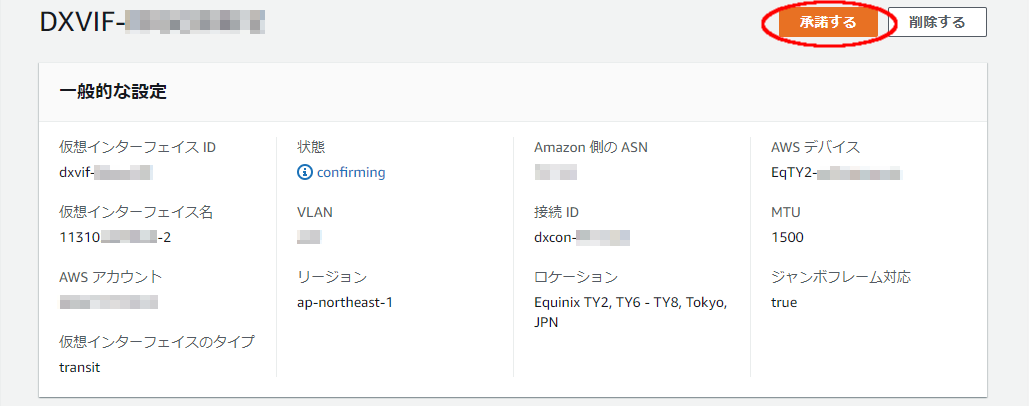 それぞれの未承諾インターフェイスのIDをクリックすると詳細画面が表示されるので、右上の「承諾する」ボタンをクリックします。