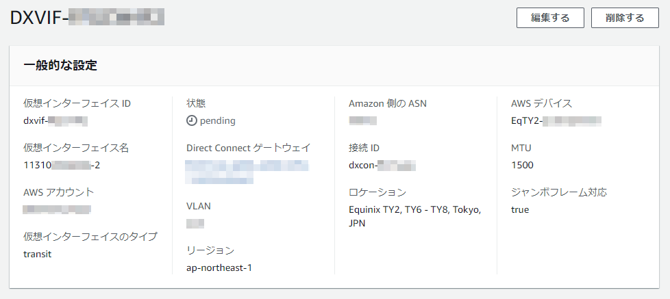 | AWS側接続先 | アジアパシフィック(東京)リージョン: Virtual Gateway アジアパシフィック(東京)以外のリージョン: Direct Connect Gateway(Transit Gateway接続可) |