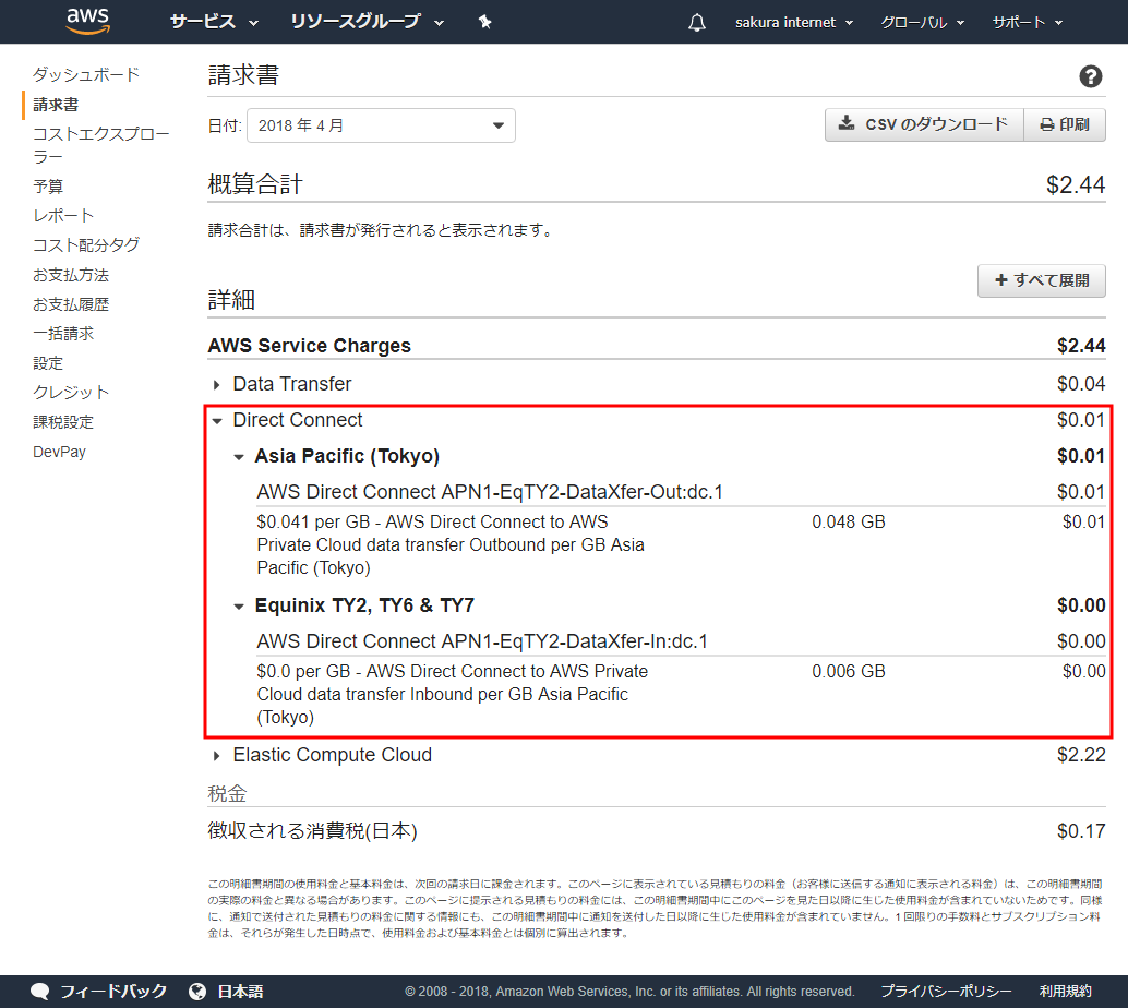 AWS → さくらインターネットのトラフィック料金は Equinix TY2 Direct Connectionロケーションまでのデータ転送料金 を参照ください。AWS側での請求・支払いとなります(Direct Connect Gatewayを使用しアジアパシフィック(東京)以外のリージョンに接続する場合は料金形態が異なります)。