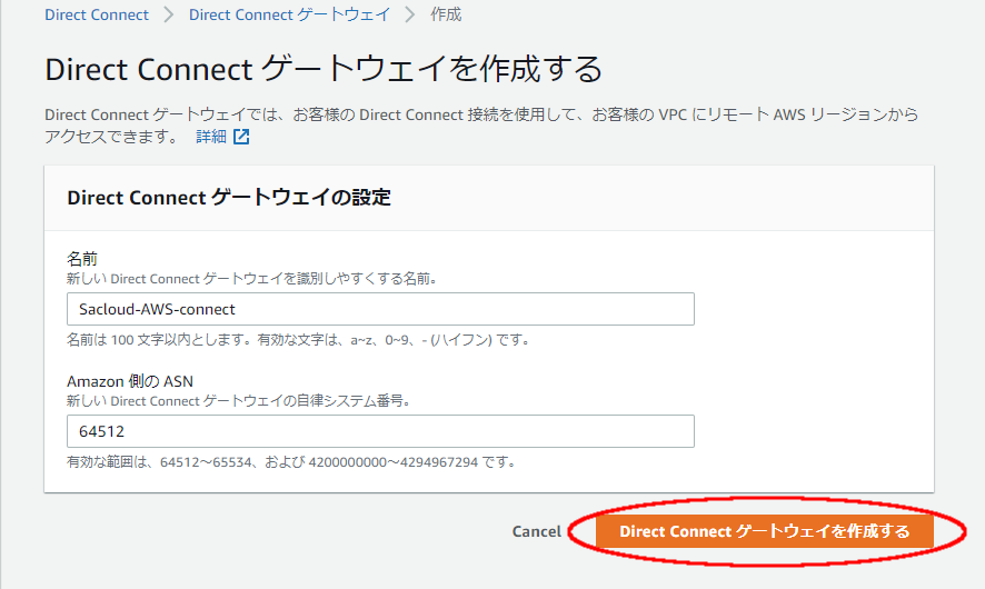 - Amazon側のASN: 他のDirect Connect Gatewayと重複しないプライベートAS番号(弊社側仕様のため2バイトASのみ; 64512~65534の範囲)のいずれかを付与します