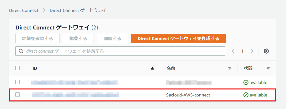 フォーム入力後、「Direct Connectゲートウェイを作成する」ボタンをクリックすると新たなDirect Connect Gatewayが作成され、一覧画面に表示されます。