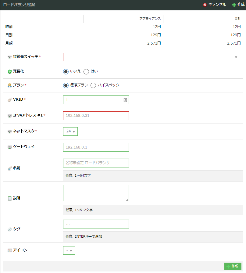 | 性能目安(最大値) | 標準プラン 送信トラフィック: 100Mbps 受信トラフィック: 100Mbps セッション数: 4,000セッション 毎秒接続数: 100cps程度 ハイスペックプラン 送信トラフィック: 1Gbps 受信トラフィック: 500Mbps セッション数: 10,000セッション 毎秒接続数: 3,000cps程度 |