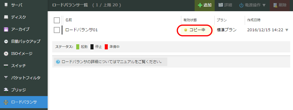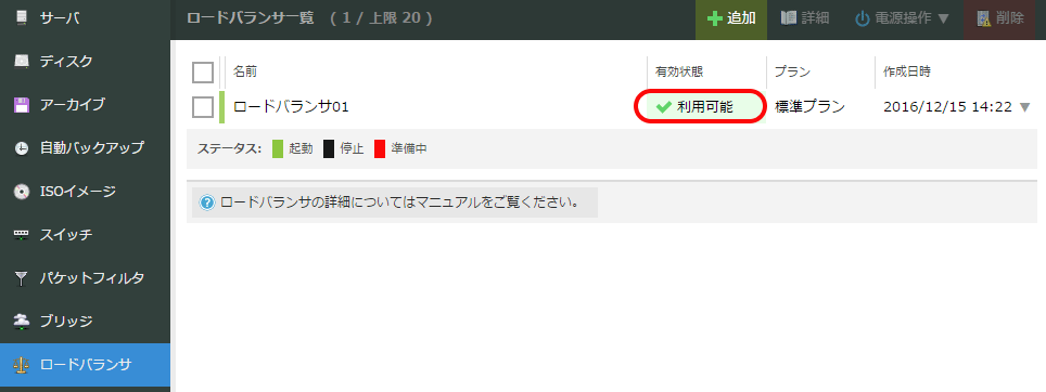 ※作成後、ロードバランサが使用可能になるまで数分程度の時間がかかります。ロードバランサ一覧画面のステータス欄で「利用可能」の表示になったことを確認後にご利用ください。