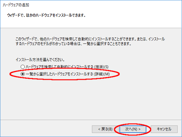 インストール方法の選択画面が表示されるので「一覧から選択したハードウェアをインストールする」を選択し「次へ」をクリックします。