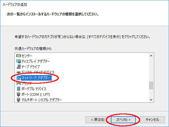 インストールするハードウェアの選択画面が表示されるので「ネットワーク アダプター」を選択し「次へ」をクリックします。