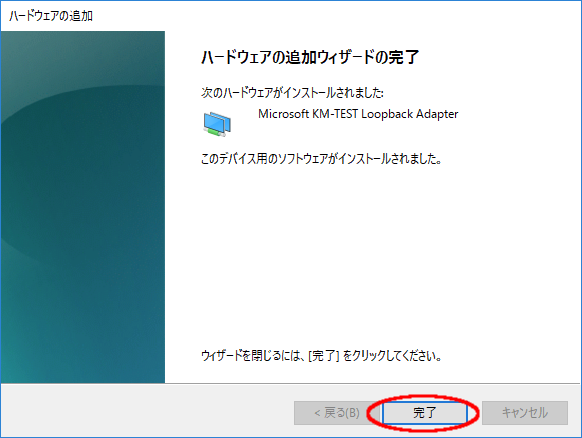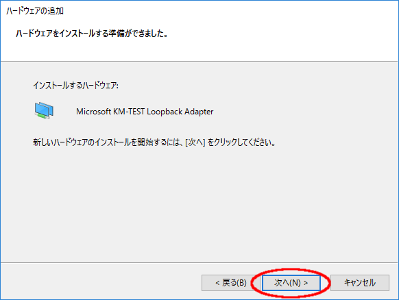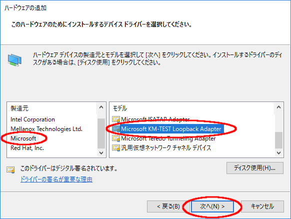 ハードウェアのモデル選択画面が表示されるので、左の製造元リストから「Microsoft」を選択後、右のモデルリストから「Microsoft KM-TEST Loopback Adapter」を選択し「次へ」をクリックします。