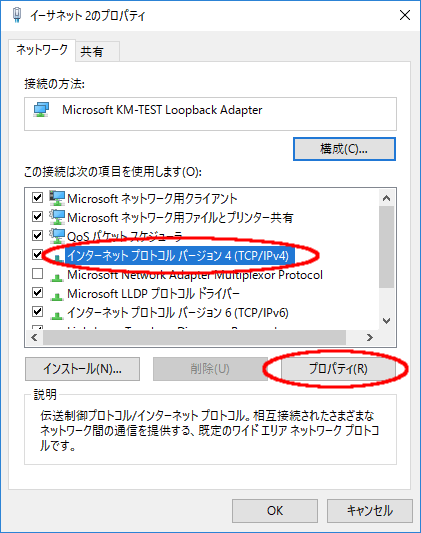 ウィザードで追加したMicrosoft KM-TEST Loopback Adapterのハードウェアを右クリックし「プロパティ」を選択します。