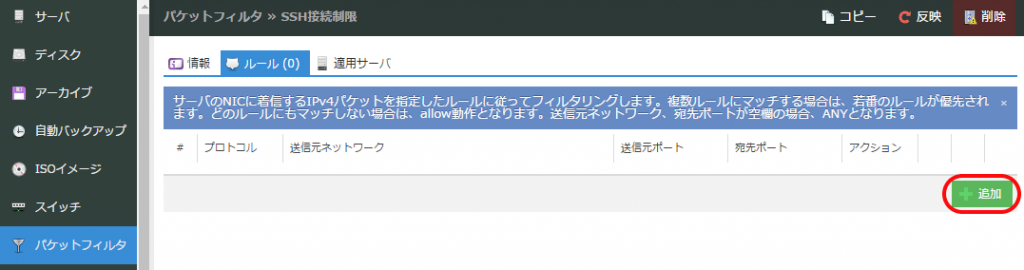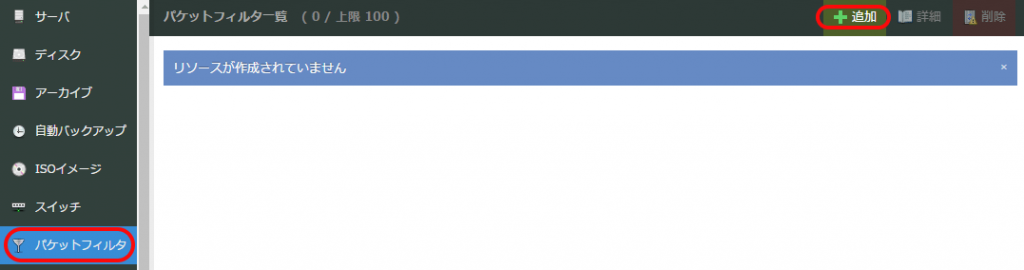 左側のサイドメニューで「パケットフィルタ」をクリックすると、作成済みのパケットフィルタ一覧画面が表示されます。新規に作成する場合は「追加」ボタンをクリックします。