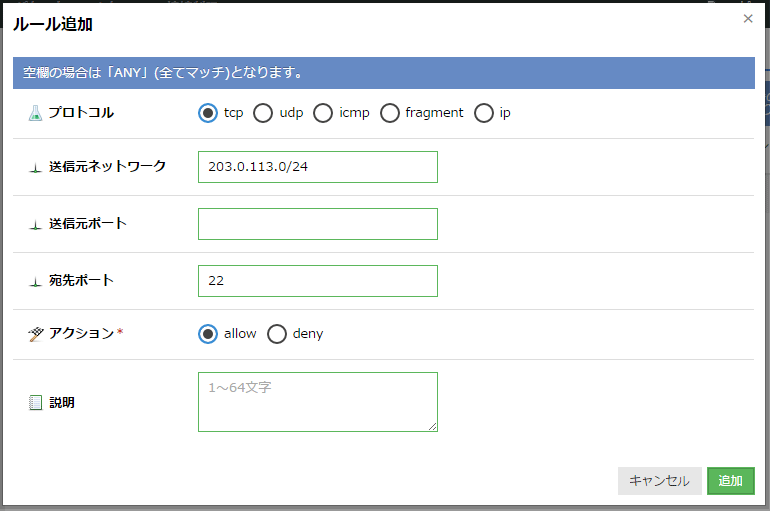 - ネットワーク・ポート入力欄を空欄で設定した場合は「ANY」(全てマッチ)として処理されます。