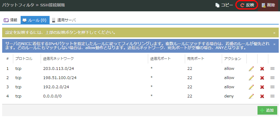 必要に応じ、同様の操作でルールを追加します。追加したルールはルールリストの下に追加されていきます。設定が完了したら右上の「反映」ボタンをクリックします。