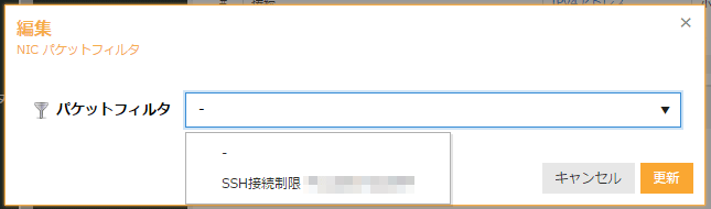 パケットフィルタ選択画面が表示されるので、NICに適用したいパケットフィルタをポップアップメニューから選択し、「更新」ボタンをクリックます。