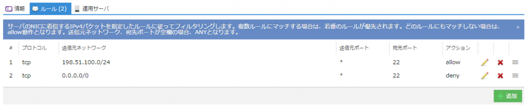 サーバに搭載される仮想NICに着信するパケットを、指定した条件(TCPやUDPなどのプロトコル、送信元ネットワーク、宛先ポートなど)でフィルタリングする機能です。サーバ内のファイアウォールなどの設定によらず、クラウドコントロールパネル上で簡単にパケット制限を行うことができます。