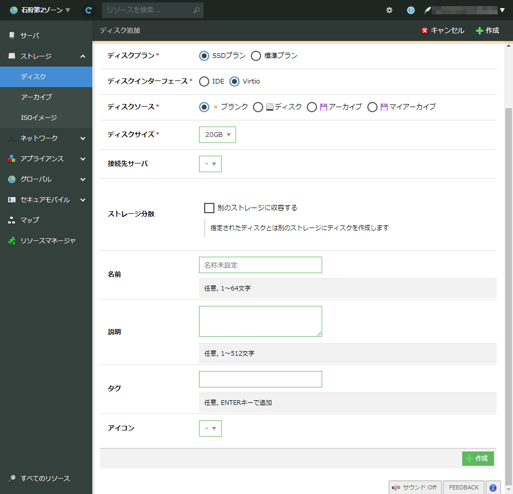 | 接続先サーバ | 作成するディスクを接続したいサーバが選択できます。未選択の場合はサーバに接続されていない状態でディスクが作成されます。 ※起動中のサーバを選択することはできません。 |