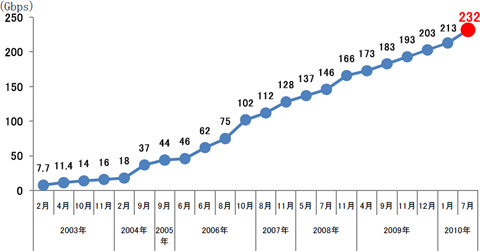 当社は、コンテンツ配信能力に優れたデータセンターとして、日本最大級のバックボーンネットワークを構築・運用しております。2010年6月のインプレスビジネスメディア社の調査によると、インターネットデータセンター回線総量ランキングで当社は213Gbpsと第1位(※1)となっており、コンテンツのリッチ化に伴う国内のダウンロードトラフィックの伸びと相まってバックボーン増強を重ね、前年比ではプラス59Gbpsで約25%増となっております。