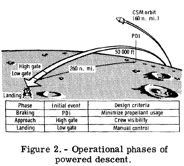 月周回軌道に到達したアポロ宇宙船は、月着陸船と司令船のふたつに分かれます。司令船には1名が残って周回軌道から支援し、着陸船に乗り移った2名が月面着陸に挑みます。月周回軌道は高度60マイル(約111キロメートル。1ノーティカルマイルは1852メートル)ですが、月着陸は高度50000フィート(約15キロメートル)から始まります。