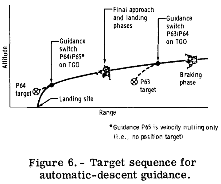 LGCはそれぞれの行程ごとに専用のルーティンを用意して対応しています。NASAは略語が大好きな組織として有名ですが、プログラムの名前も相当なものです。ブレーキングフェーズを担当するプログラムはP63といいます。P63は着陸船を高度50000フィートから7000フィートの目標点(月面上空)へ導きます。目標点に到達すると、自動的に次のプログラムP64が起動します。