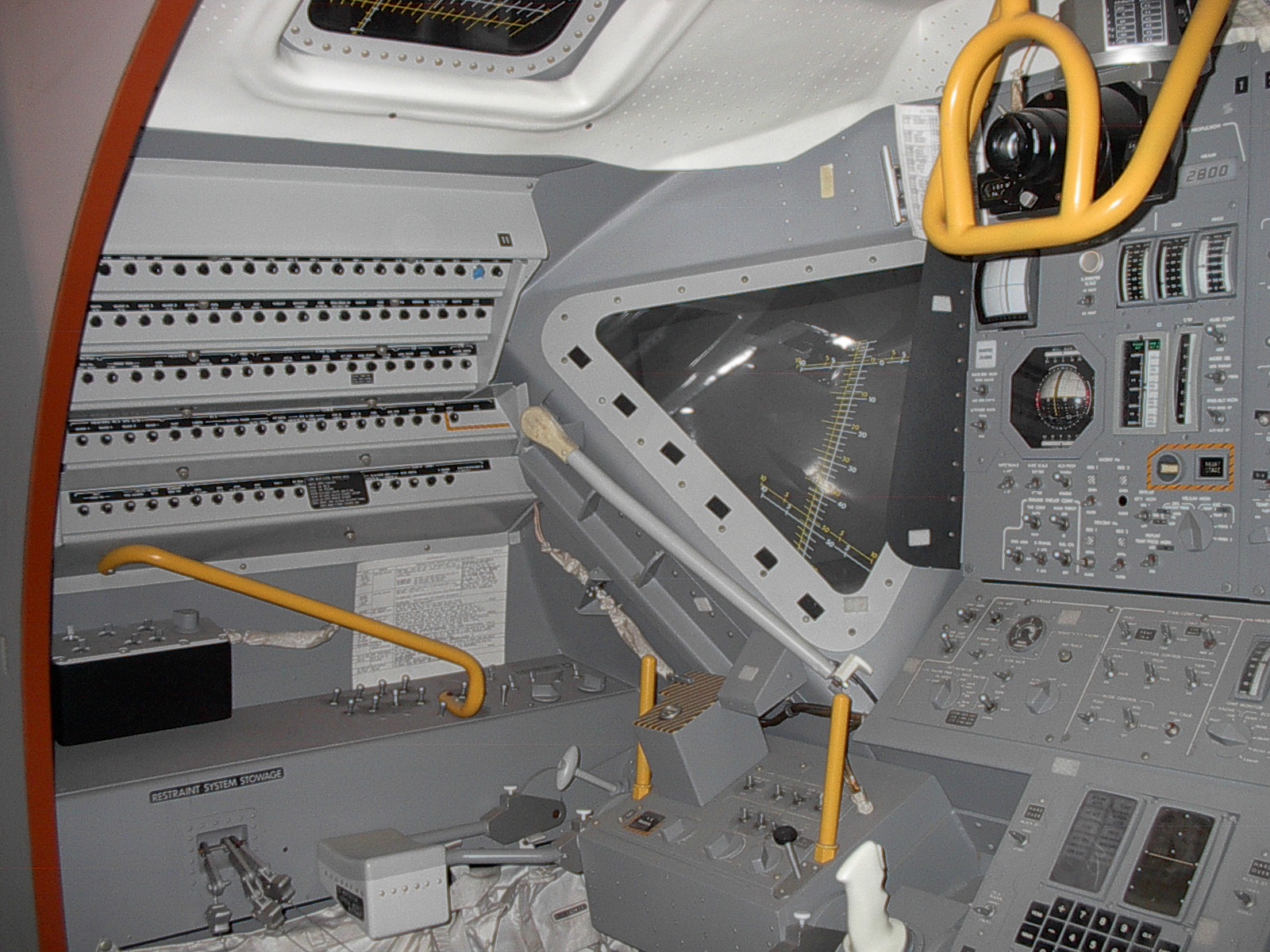 着陸船の操縦士側の窓ガラスには、照準のような線が刻まれています。写真の中央に見える三角形のガラス部分がその窓です。