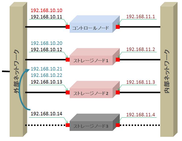また、外部ネットワーク、内部ネットワークそれぞれの物理的なネットワークを構成するため、それぞれのノードでは2つのギガビット以上のネットワークインタフェースを持つ必要があります。