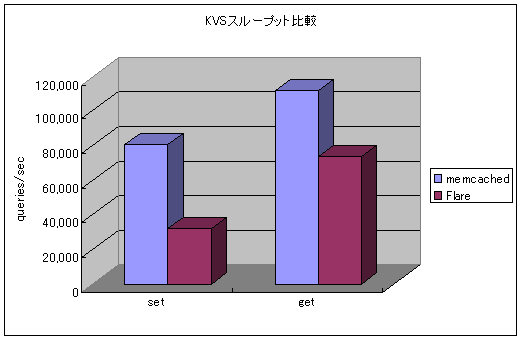 memcachedは完全にオンメモリで動作しますので単純な比較はできませんが、Flareはmemcachedに比べ、Setは約1/2.5、Getについては約1/1.5の性能を有することがわかります。