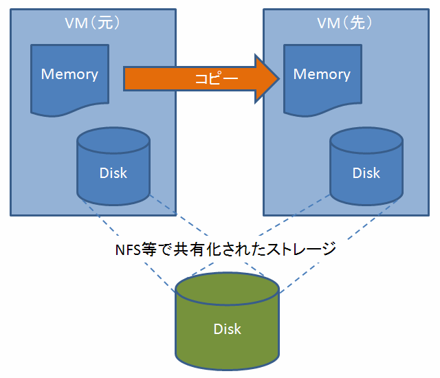 2台のホストサーバ(転送元と転送先)と共有ファイルシステムとしてNFSサーバを1台用意します。NFSサーバはなんでもOKですが、ホストサーバは同一スペックでなければいけません。転送元のホストを192.168.12.45、転送先ホストを192.168.12.46とします。なお、2台のホストから見たNFSサーバのマウントポイントは、同じpathになっていることが望ましいようです。