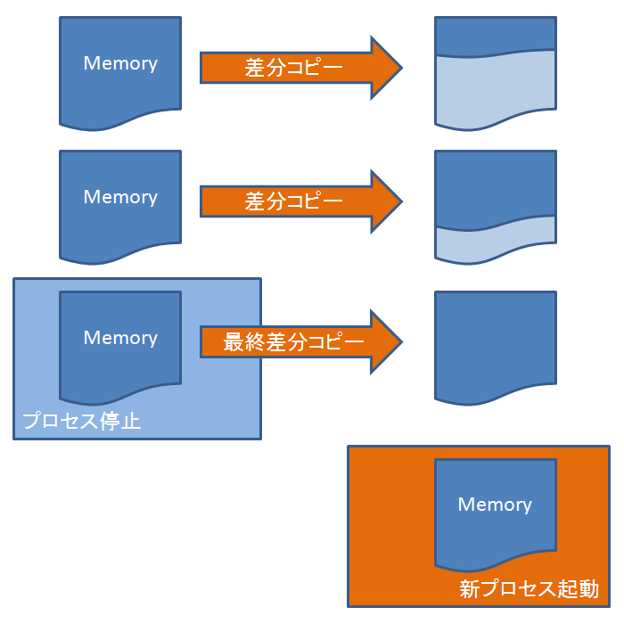 - プロセスが動いている間に書き換えられたメモリを再度転送する